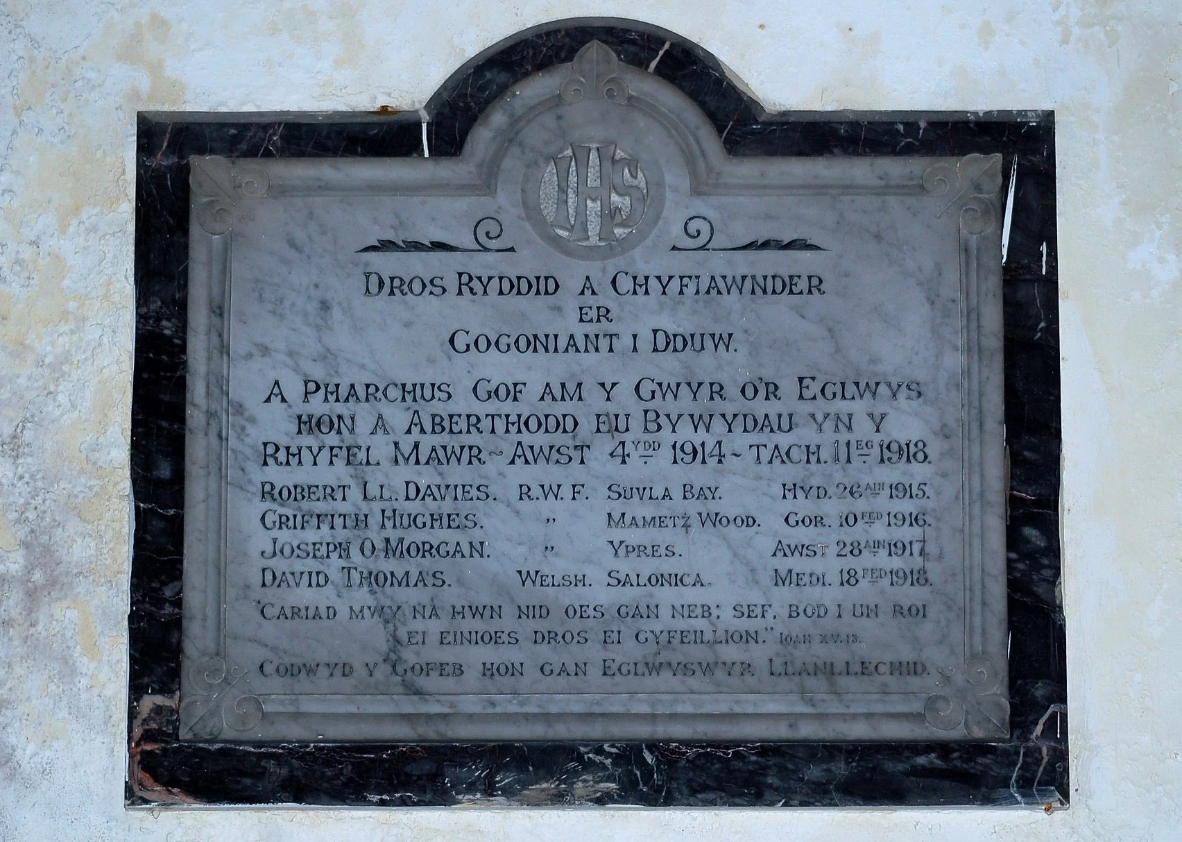 Y tu mewn i Eglwys St. Llechid mae cofeb wedi'i gosod ar un o furiau’r eglwys yn coffáu bechgyn a laddwyd yn ystod y Rhyfel Byd Cyntaf. Dyma'r hyn sydd wedi'i ysgrifennu arni: