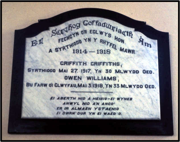 Enw llawn Griffith, oedd Griffith Edmund Griffiths a bu farw ar yr 27ain o Fai 1917. Roedd wedi priodi gyda merch o’r enw Hannah, ac roeddynt yn byw yn rhif 4 Mountain Rd. Rachub, yn ôl cyfrifiad 1911. Bu Owen Williams farw o’i glwyfau ar y 3ydd o Fai 1918, yn Ffrainc, yn 33 mlwydd oed. Mae Owen wedi ei goffáu ar garreg fedd y teulu yn Eglwys Llanllechid. “Er serchog goffadwriaeth am Ellen Williams, annwyl blentyn Morris a Mary Williams, Caegroes, a fu farw Mawrth 30ain 1891, yn flwydd a naw mis oed. Hefyd Morris Williams, anwyl briod Mary Williams, yr hwn gyfarfyddodd â damwain yn chwarel y Penrhyn Tachwedd 25ain 1891, yn 29 mlwydd oed. Hefyd Owen Williams, a fu farw o’i glwyfau yn Rouen, Frainc, Mai 3ydd 1918, yn 33 mlwydd oed. “Fel blodeuyn y daw allan, a torrir ef ymaith, ac efe a gilia fel cysgod, ac ni saif” Job xiv. 2 Hefyd ei briod Mary Williams, a fu farw Hydref 29, 1944, yn 86 mlwydd oed. “Hedd perffaith hedd”.
