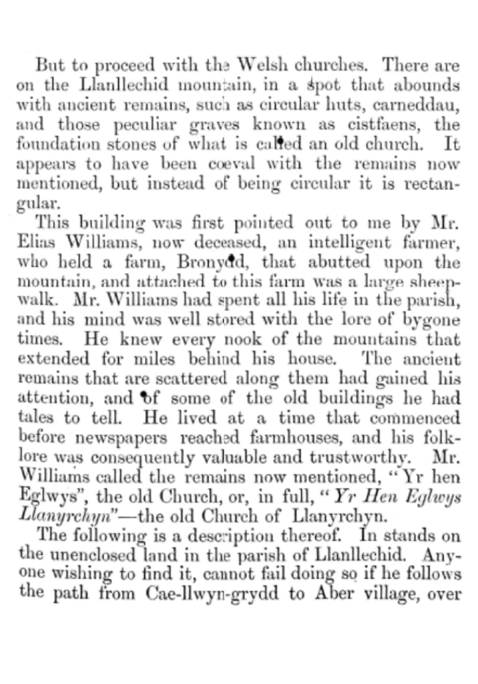 ‘Llanerchyn, neu Llan Iyrchyn yng Nghwm Ocwm oddiar Chwarel Bryn Hafod y Wern, a berthynai o bosibl i’r cynoesoedd, er fod rhyw ad-drefniad wedi bod ar y lle, fel y dengys amryw olion tai ysgwar sydd yno eto, ynghyd a gweddillion eglwys. Tybir mai y Rhufeiniaid a ddysgodd i’n cyndadau wneyd tai ysgwar. Hwyrach fod yr olion tai ysgwar ynghyda hen furddyn sydd gerllaw yn cael ei alw yn ‘Dŷ Rolant Pen Pres’, (oddi wrth ei helmet) yn dangos fod a wnelai y canoloesoedd â’r lle.’