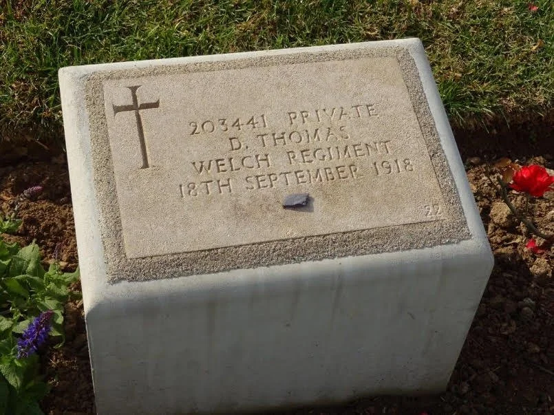 Mab i Richard a Catherine Thomas, Hen Barc, oedd David. Bu farw ei fam rai blynyddoedd cyn dechrau’r Rhyfel Byd Cyntaf, yn 41 mlwydd oed. Lladdwyd David yn Salonica, gwlad Groeg, yn 31 oed. Dyma lun o’i garreg fedd yn Doiran Military Cemetery, Groeg. Rhoddwyd y darn bach o lechen o Chwarel y Penrhyn ar ei fedd gan Bryn Thomas, aelod o deulu David Thomas, rai blynyddoedd yn ôl, pan fu ar bererindod i weld bedd David.