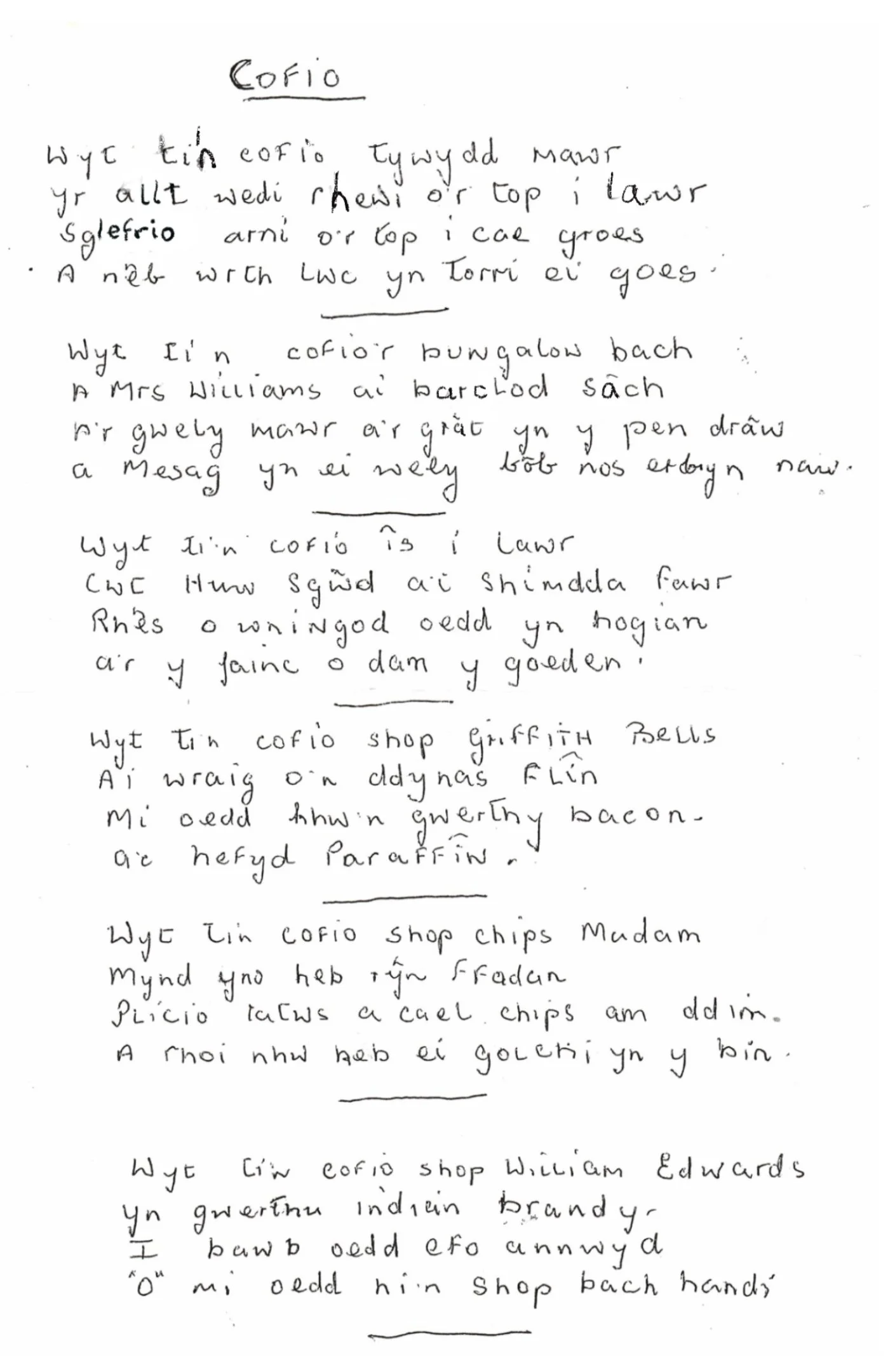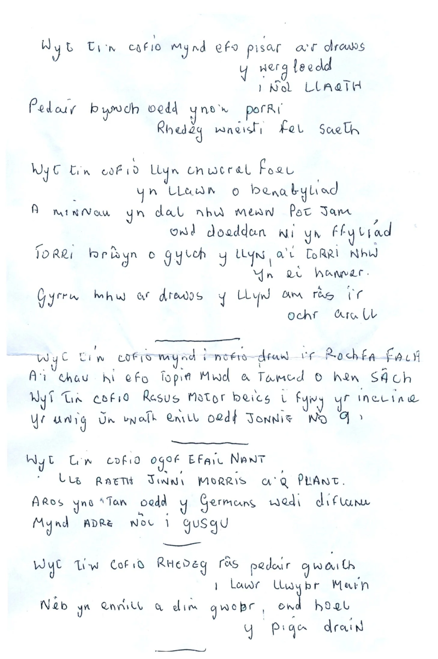 Dyma gyfres o benillion a ysgrifenwyd gan Mrs. Eileen Griffiths (Llan) i’w chwaer, Blodwen ym 1985. Ynddynt ceir darluniau hyfryd o fywyd yn Rachub pan oedd Eileen yn ifanc, a delweddau gwych o hen gymeriadau ac arferion y cyfnod. Crybwyllir siopau Griffiths Bells, William Edwards, Margiad Parry ac wrth gwrs siop chips Madam, yn ogystal â Ffair Llan a Dawns John ‘P’. Sonnir am y defnydd a wnaed o Ogof Efail Nant yn ystod cyfnod y rhyfel ac am yr arferiad o fynd â thoes i Fecws Cae’r Groes ar gyfer ei grasu. Mae nifer helaeth o gyfeiriadau at bethau nad ydynt yn cael eu defnyddio bellach e.e. barclod sach, casgen bren, mul untroed, mul trithroed a hanner coron. Diolch i Ken Griffiths am gael cynnwys y penillion ar y wefan.
