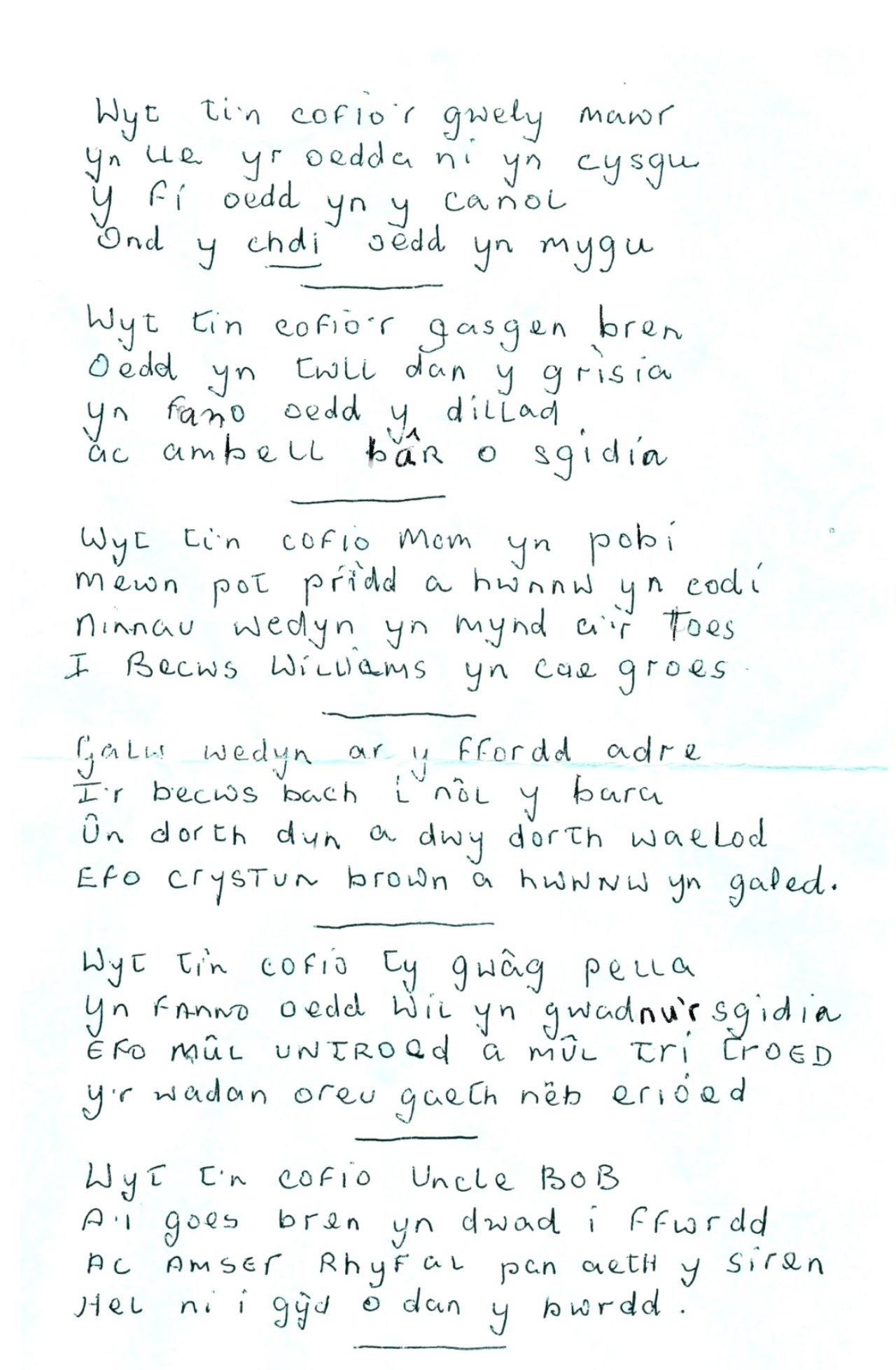 Just a word or two to you hope that you arrive there safe, last night Tues [?] we had all a great shock a German aeroplane came here about eight o clock at night with out any warning to us, so she came over the mountain what lights and flares she has got she was wandering about all the time so she drop her bomb at Caellwyngrydd, killed Mrs Davies Llwynderw her house came down it was a direct hit cut down the light we were all in the dark, through the night till morning what a night we were all in Mrs Roberts tŷ nesaf in twll dan y grisiau, Capel Batis his windows torn to pieces, Griffith John bake House pant Hwfa Field council house is by Capel Batis and many other places around Bethesda I do not want to see any of them again, I hope that you are quite safe that is the reason that I am sending this letter to you to day, I got no more news to say this time, we are all around here upset, after last night and this from Your Father and Mother